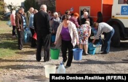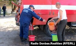 Третий день без воды живут люди в Торецке и пригородах. Авария на водогоне произошла еще в понедельник. Сегодня в городе объявлена чрезвычайная ситуация. С ведрами, бидонами и канистрами люди выстраиваются в очередь у пожарных машин, чтобы набрать воды.