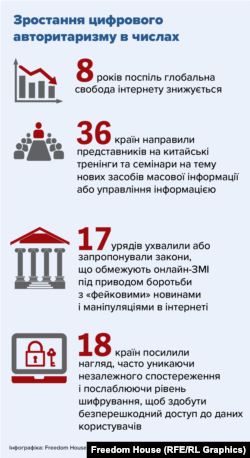 Уряди в багатьох країнах світу посилюють контроль над доступом своїх громадян до вільної інформації в мережі інтернету. При цьому для придушення інакомислення використовують гасло боротьби з «фейковими новинами». Таких висновків доходить в останній редакції свого щорічного звіту про свободу в інтернеті американська неурядова організація Freedom House. Звіт під назвою Freedom on the Net 2018 охоплює 65 країн, на які припадає 87% користувачів інтернету по всьому світу. Україну в цій доповіді позиціонують як «частково вільну» державу, де, однак, «помітних змін не відбулося».