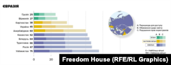 До країн, де інтернет перебуває у найбільш загрозливому стані, належать Казахстан (62), Білорусь (64) Росія (67), Узбекистан (75).