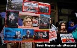 На одному з плакатів було написано: «Грабує в Росії. Вбиває в Україні. Дружина у Франції».