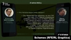«Це Міністерство оборони, це Головне управління розвідки. Зараз Гєна (Геннадій Касай – ред.) не бере слухавку, в них зараз зустріч з керівником цього відділу, цього підрозділу. Гєна в курсі справи – має зараз з ними… з ним там це питання обговорювати. Наталія Борисівна (Ульяненко – ред.) теж зі свого боку підключилась», – говорив телефоном Богуслаєву 21 квітня 2022-го року Павло Касай.