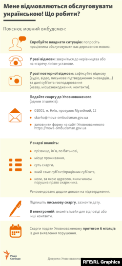 Що робити, якщо відмовляють обслуговувати українською? Тримайте інструкцію від мовного омбудсмена. Не забувайте: інформація про товари та послуги може дублюватися іншими мовами, а клієнта можна обслуговувати й не державною, якщо він наполягає і є прийнятна для всіх мова комунікації.