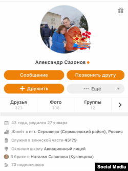 Олександр Сазонов у списку ЦОС значиться як старший офіцер, майор. Олексію 43 роки. Судячи зі сторінки у російській соцмережі «Однокласники», він із селища Старишево в Амурській області Росії (область межує з Китаєм).