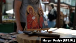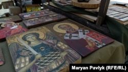 «Потім ще у нас замовили і так почалась наша майстерня. Це ікони на дереві під старовину, вони зроблені в авторській технології, є повністю писані, а є в цій техніці авторській. У нас частина робіт написана на старовинному дереві, взятому за старих меблів. Ікона на такому дереві особливо автентично виглядає.