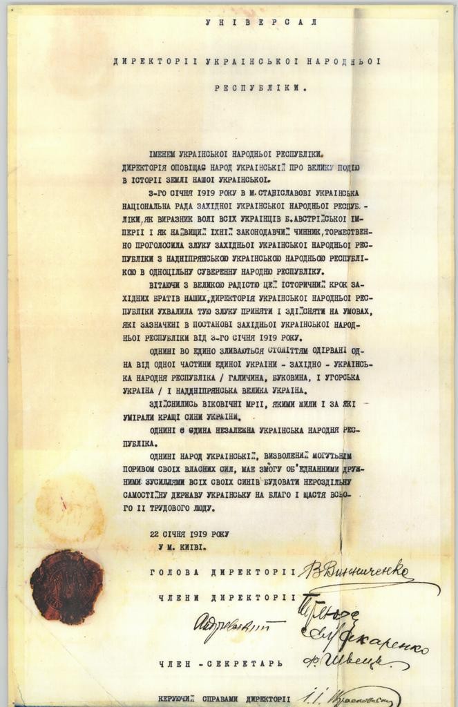 Член Директорії Федір Швець урочисто проголосив текст Універсалу Директорії від 22 січня 1919 року: «...Однині воєдино зливаються століттями відірвані одна від одної частини Єдиної України – ЗУНР (Галичина, Буковина, Закарпаття) і Наддніпрянська Велика Україна. Здійснилися віковічні мрії, якими жили і за які умирали кращі сини України. Однині є єдина незалежна УНР. Однині Народ України, визволений могутнім поривом своїх власних сил, має змогу об’єднаними дружніми зусиллями всіх своїх синів будувати нероздільну самостійну державу Україну на благо і щастя всього її трудового люду».
